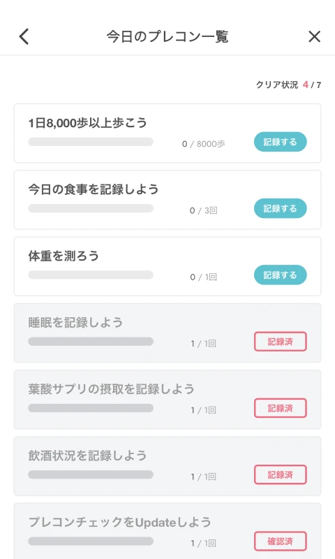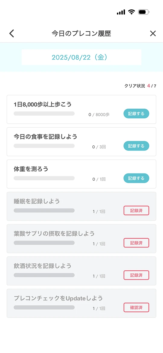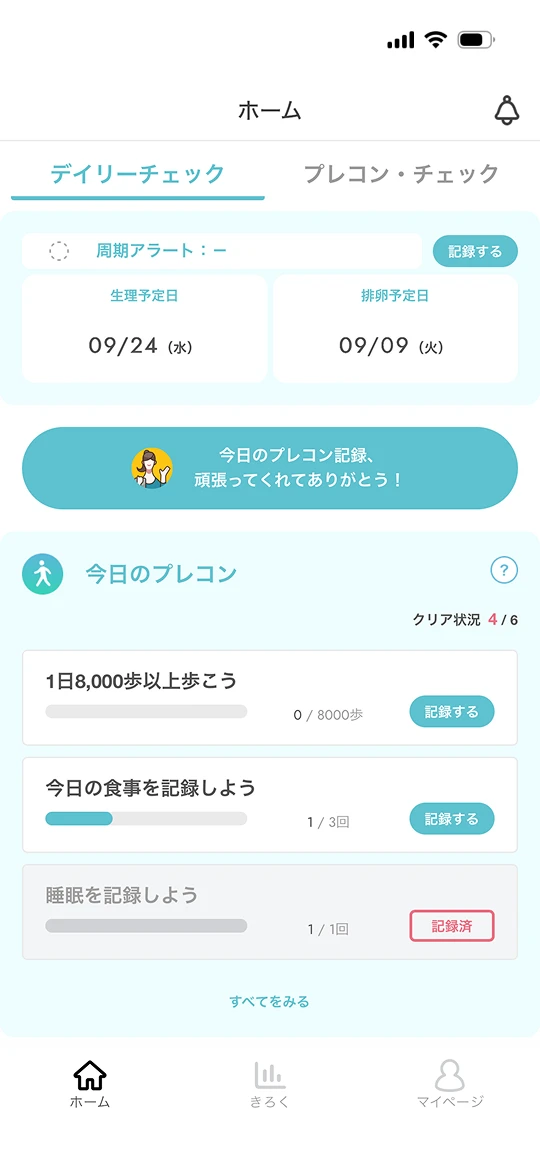 変化を実感しやすく生理・歩数・睡眠・体重・飲酒・葉酸摂取など、各種ヘルスデータの記録・連携が可能。AppleヘルスケアやFitbitなどとの連動により、変化の見える化と効力の体感が期待できます。