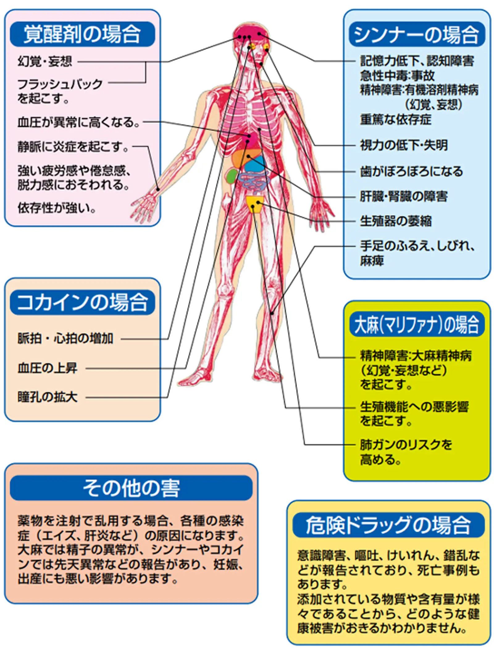 覚醒剤や麻薬、大麻、危険ドラッグなどの薬物の使用は、違法であるというだけでなくあなたの健康やあなたの周りの人々に計り知れない害悪(下図)をもたらします。ほんのちょっとした好奇心から安易に使い始めてしまうと、抜け出せなくなる可能性があります。絶対に使わないでください。2)